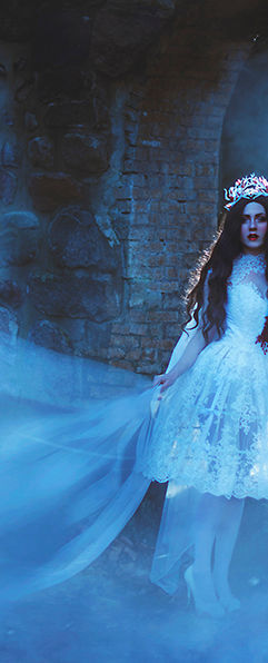 A ghostly ensemble created in white beaded lace fabric. The dress has white steel boned cage underskirt.